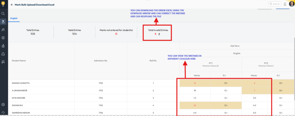 If you encounter invalid entry errors while uploading marks, follow the steps below to resolve them: