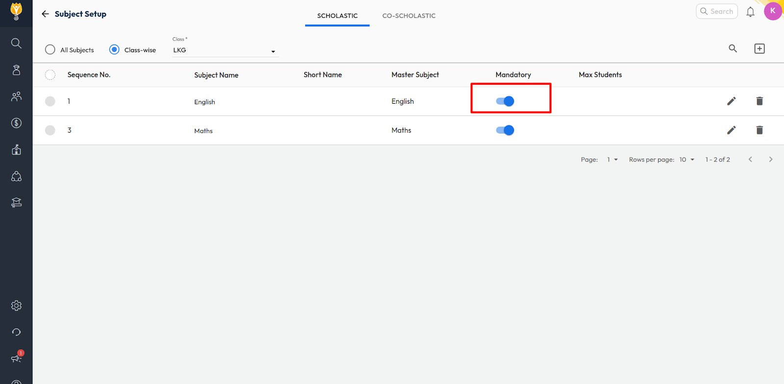 • The Mandatory toggle can be disabled only if no marks have been entered for that subject.
