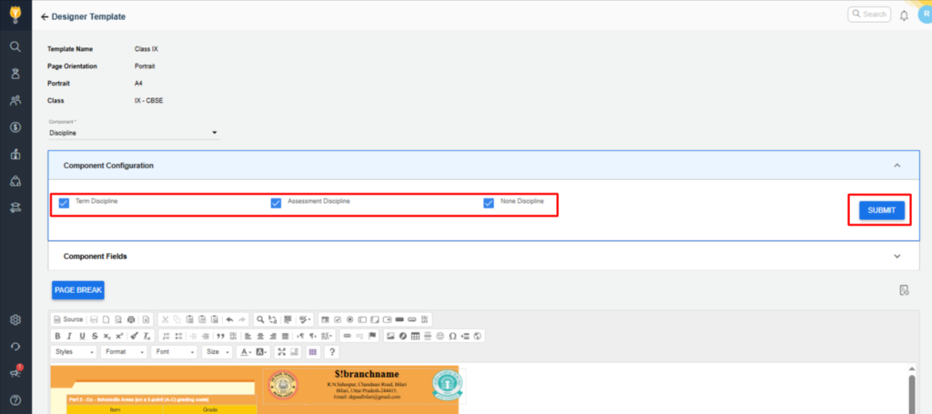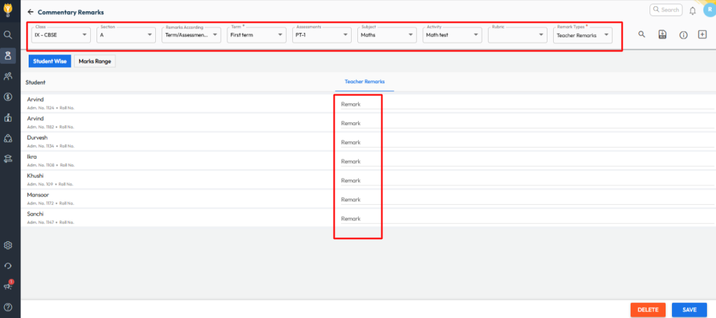 - Select the Class, Section and Term, Assessment, Subject & Activity