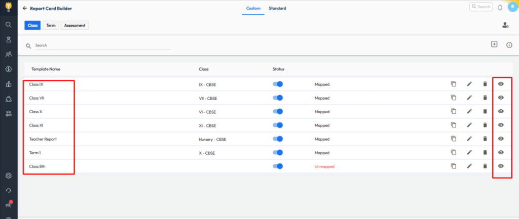 - Locate the required report card template and click the Eye (View) icon to open and edit it.