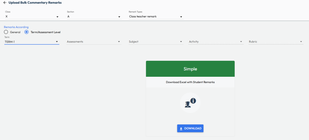 - Term / Assessment Level – for term or assessment wise remarks (e.g., Term 1, Term 2)