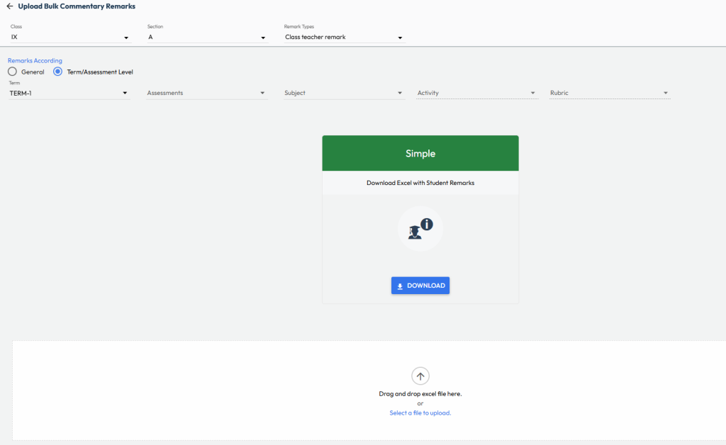- Select the same Class, Section, Remarks Type, and other filters (Term, Assessment, Subject, etc.) used during download.