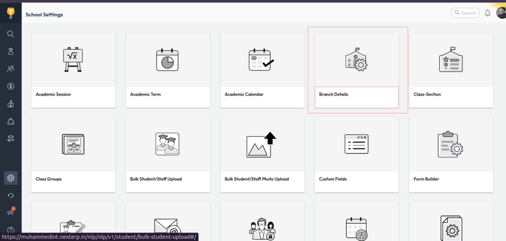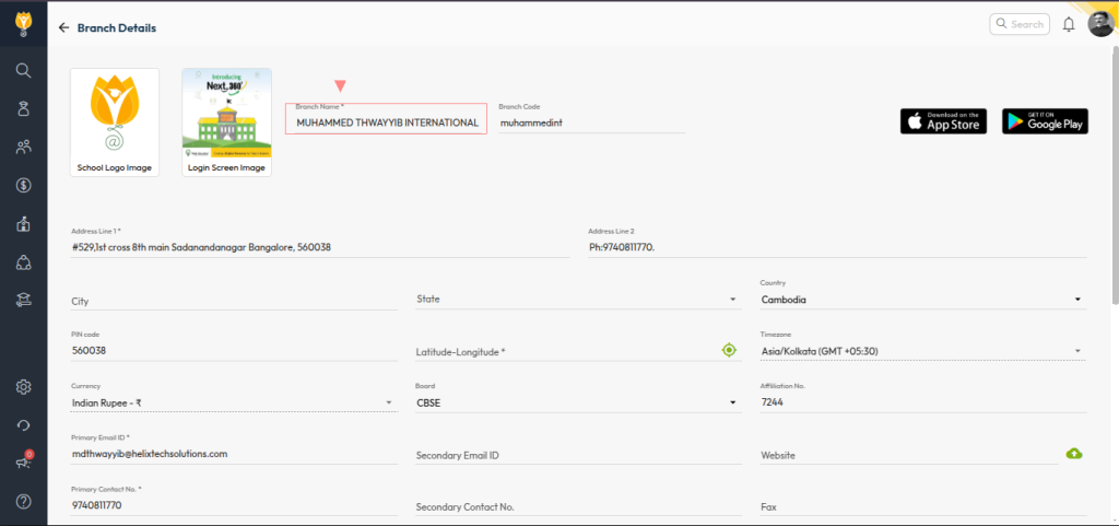 You can update the school header displayed on fee receipts by modifying the school name under branch details setting.