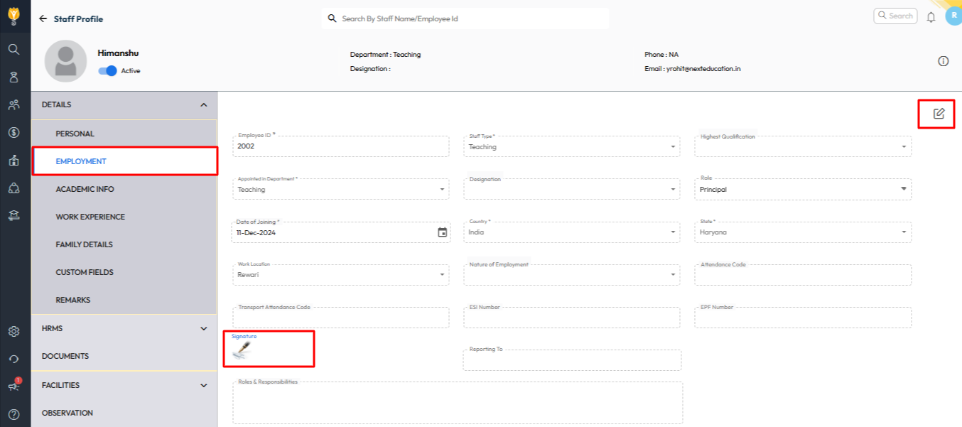 2. Open the staff profile, go to the Employment section, click Edit, and upload the signature.