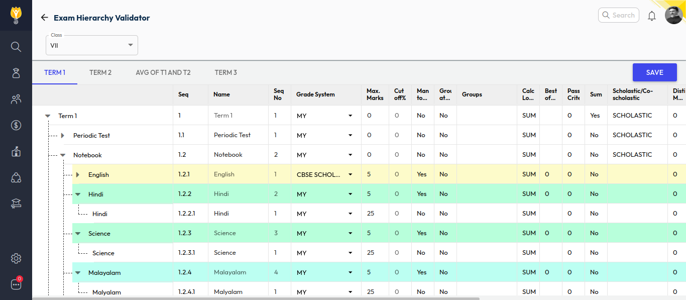 - Select the specific class, and you will be able to view the entire exam structure configured for that particular Class > Term in the school.