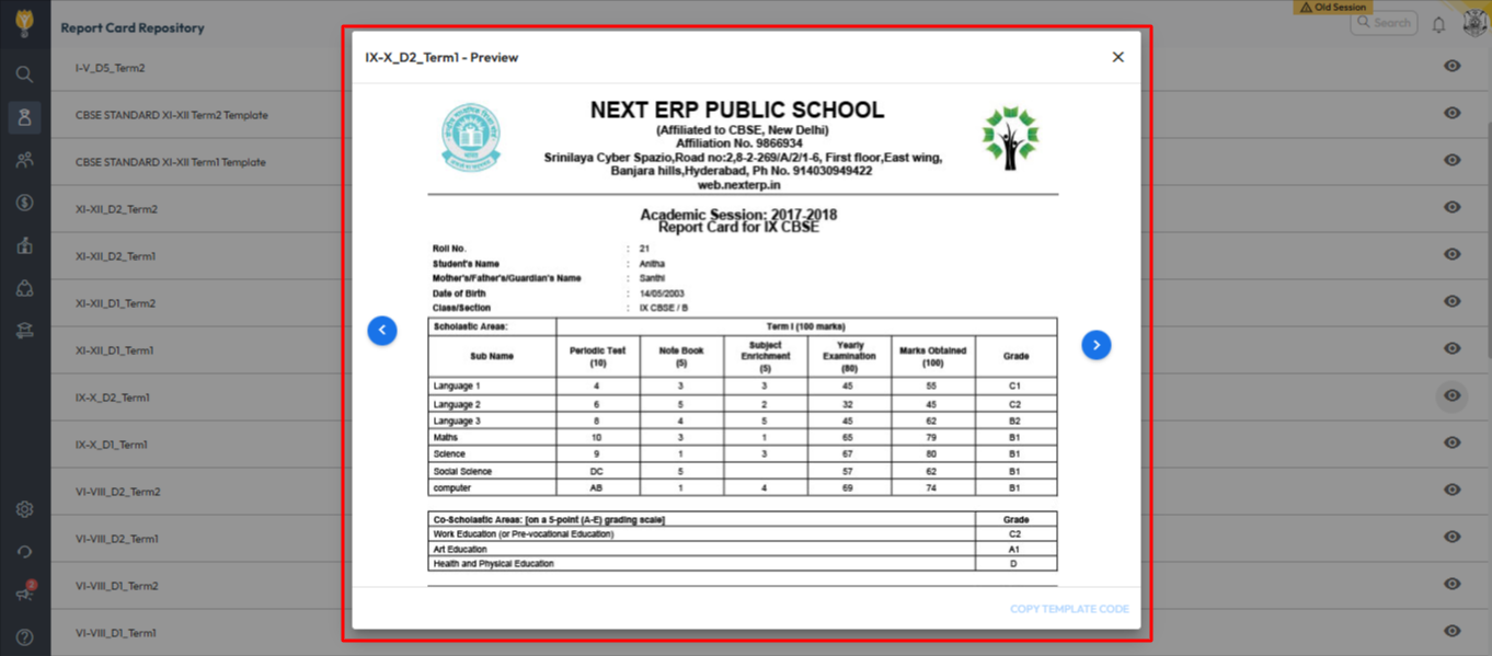 - If a template meets your requirements, click on ‘Copy Template Code’ and paste it into the Report Card Builder page.