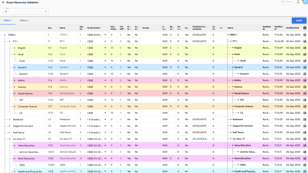 You can use the Exam Hierarchy Validator to review and verify the exam structure configured for your school. This tool displays all assessments, subjects, activities, and related settings for the selected class and term.