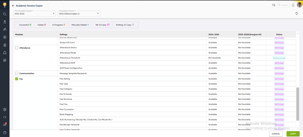 - Navigate to Settings > Administration > School Setup > Academic Session Copier.