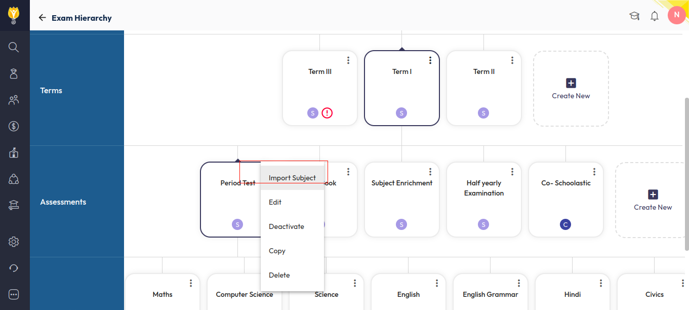 - Click on the three dots next to the assessment where you want to add the subject, then select Import.
