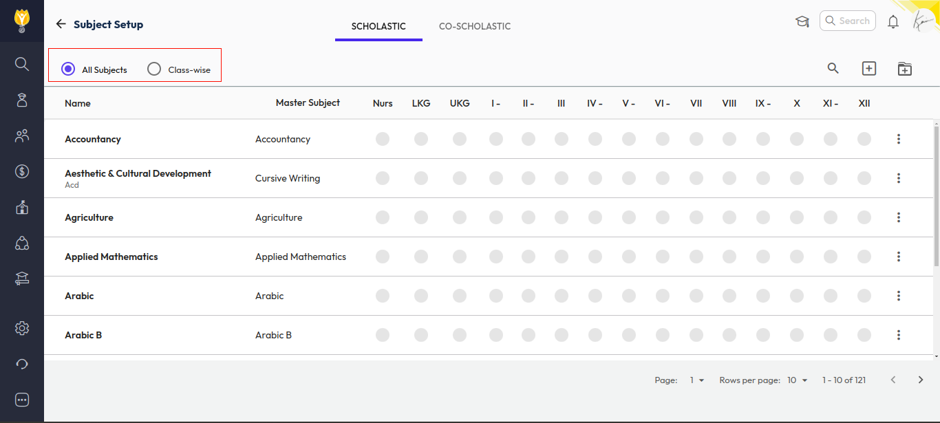 - In Subject Setup, you will see two options: All Subjects and Class Wise.