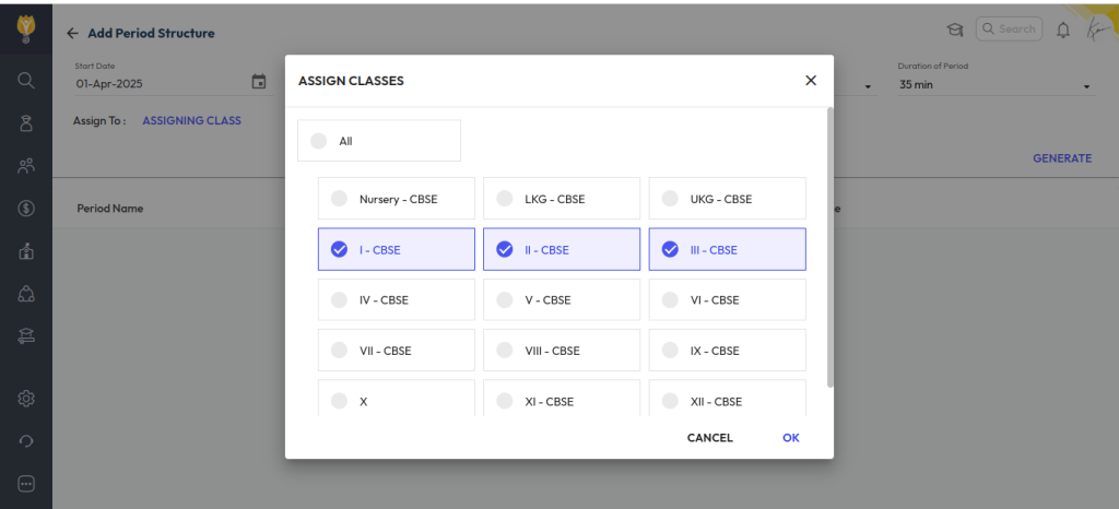 - The selected classes will now follow this period structure, allowing different groups to have customized timetables.