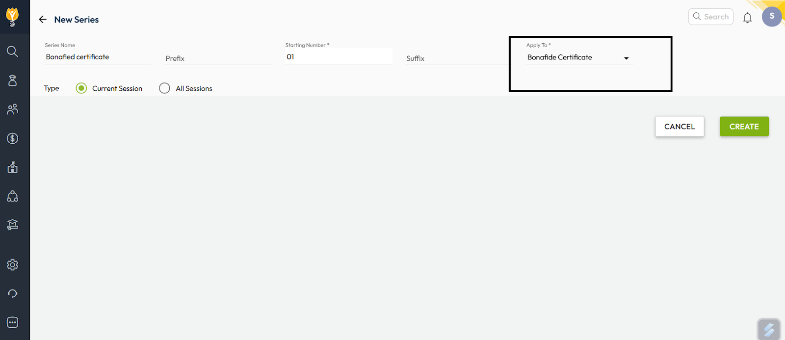 - Click on + symbol which is visible on the right side, Enter Series Name, Perfix. Starting No.(It will be incremental), and Suffix if required.