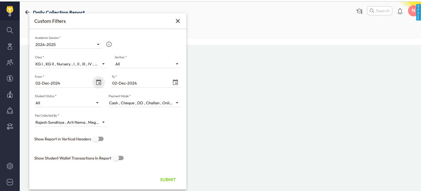 - Set the filters as per your requirements, such as specific class, dates, payment mode etc.