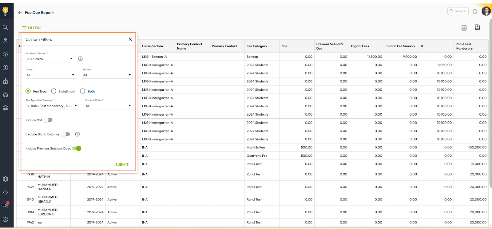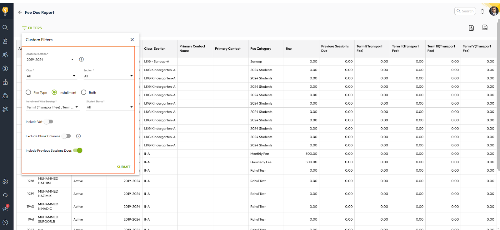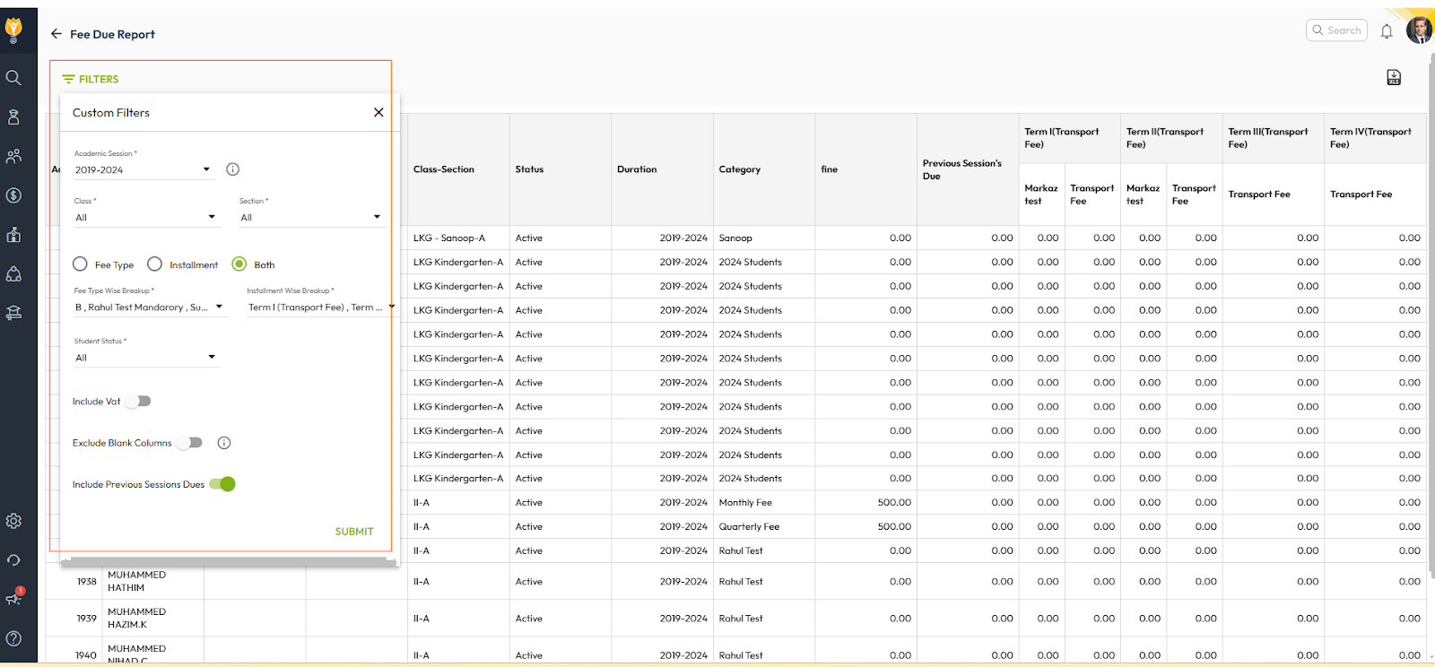 The Fee Due Report provides detailed insights into a student’s outstanding fees. The following information is included in the report: