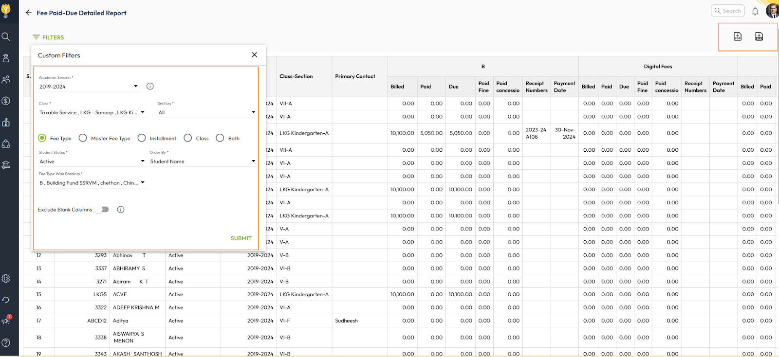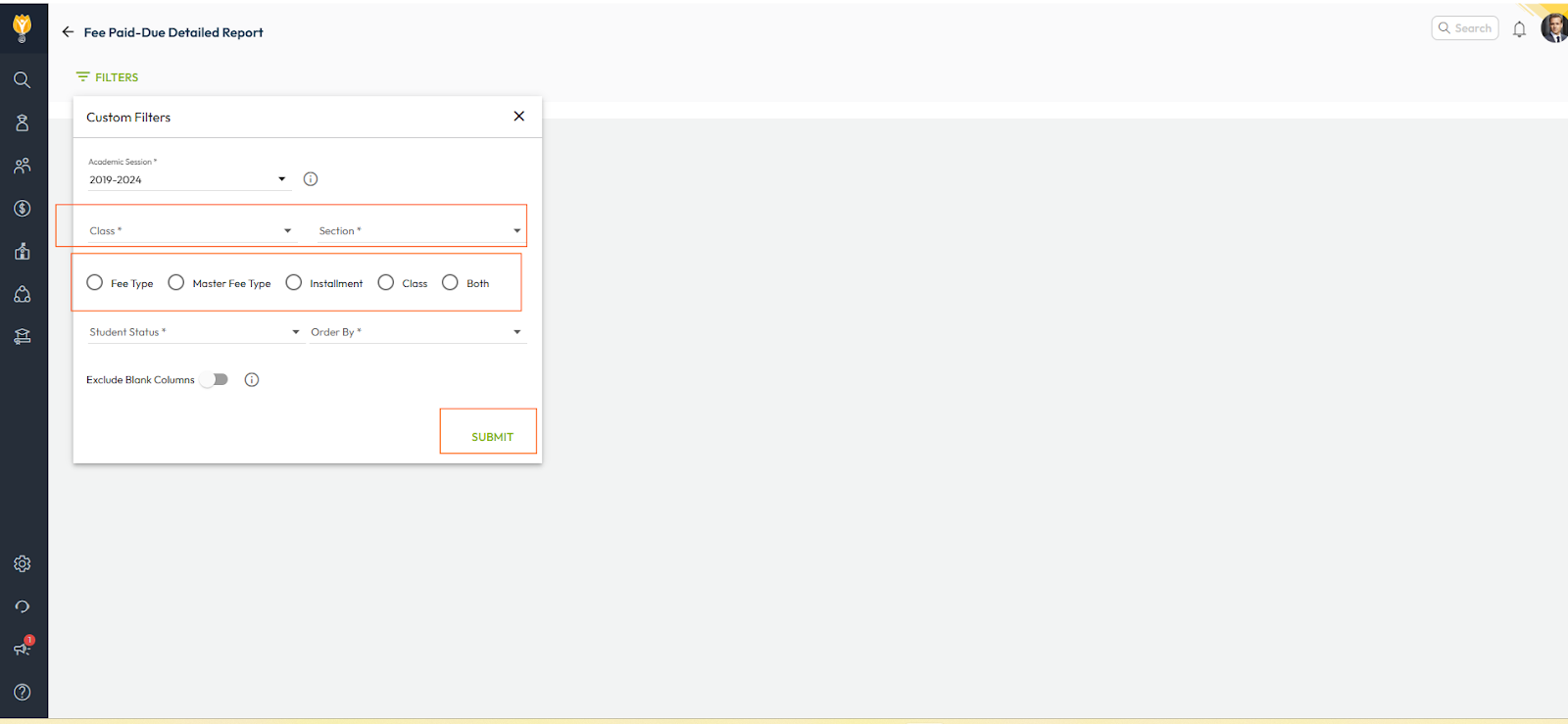 3. Set the filters as per your requirements, such as specific class, fee type, or instalment.