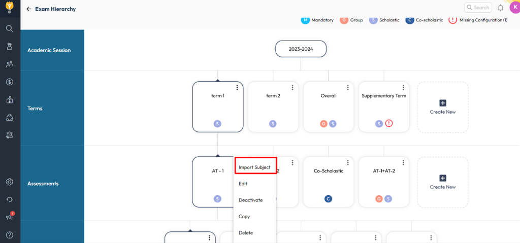 To replace or delete a subject from the Exam Hierarchy, you must first remove any existing marks for that subject. Once marks are cleared, you can delete the subject and import a new one if needed.