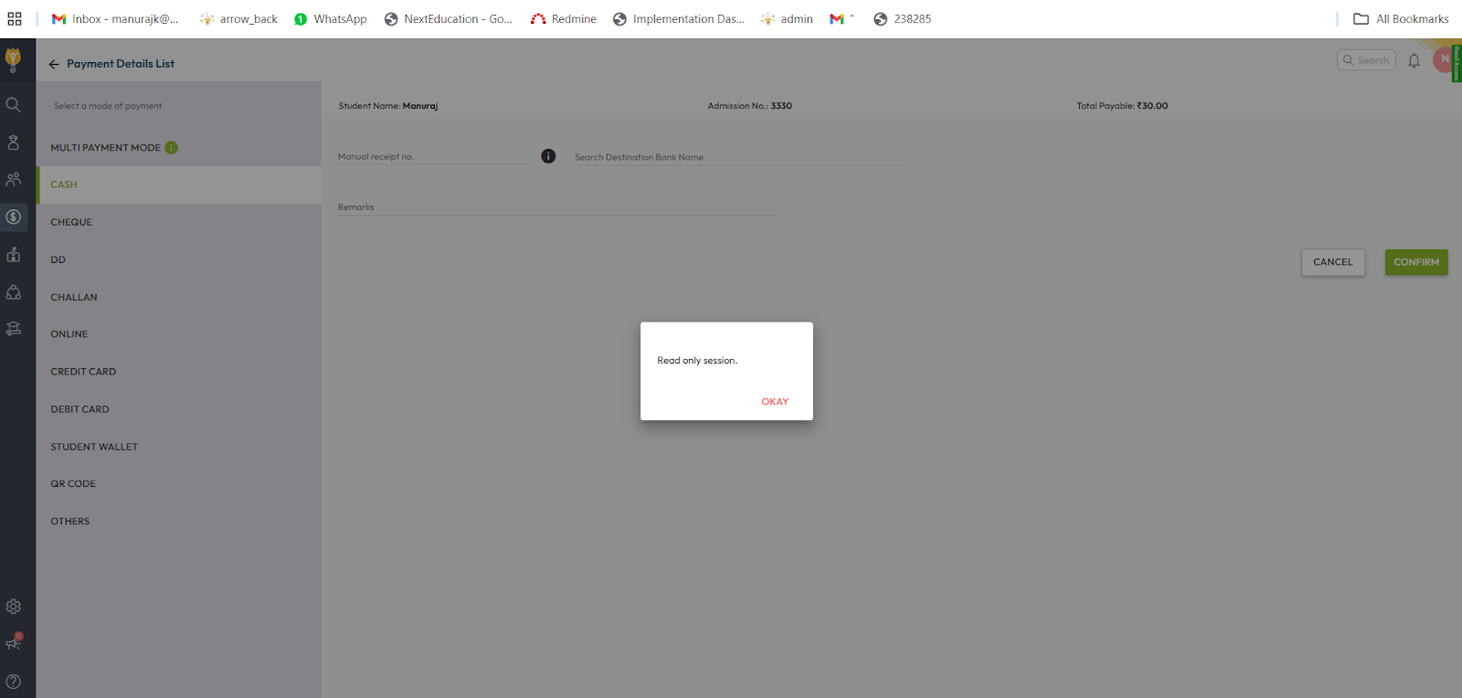 If the school’s payment is overdue and has not been cleared for a long time, the system may be switched to read-only mode. In this mode, you can view data but cannot perform any transactions, including fee collection.